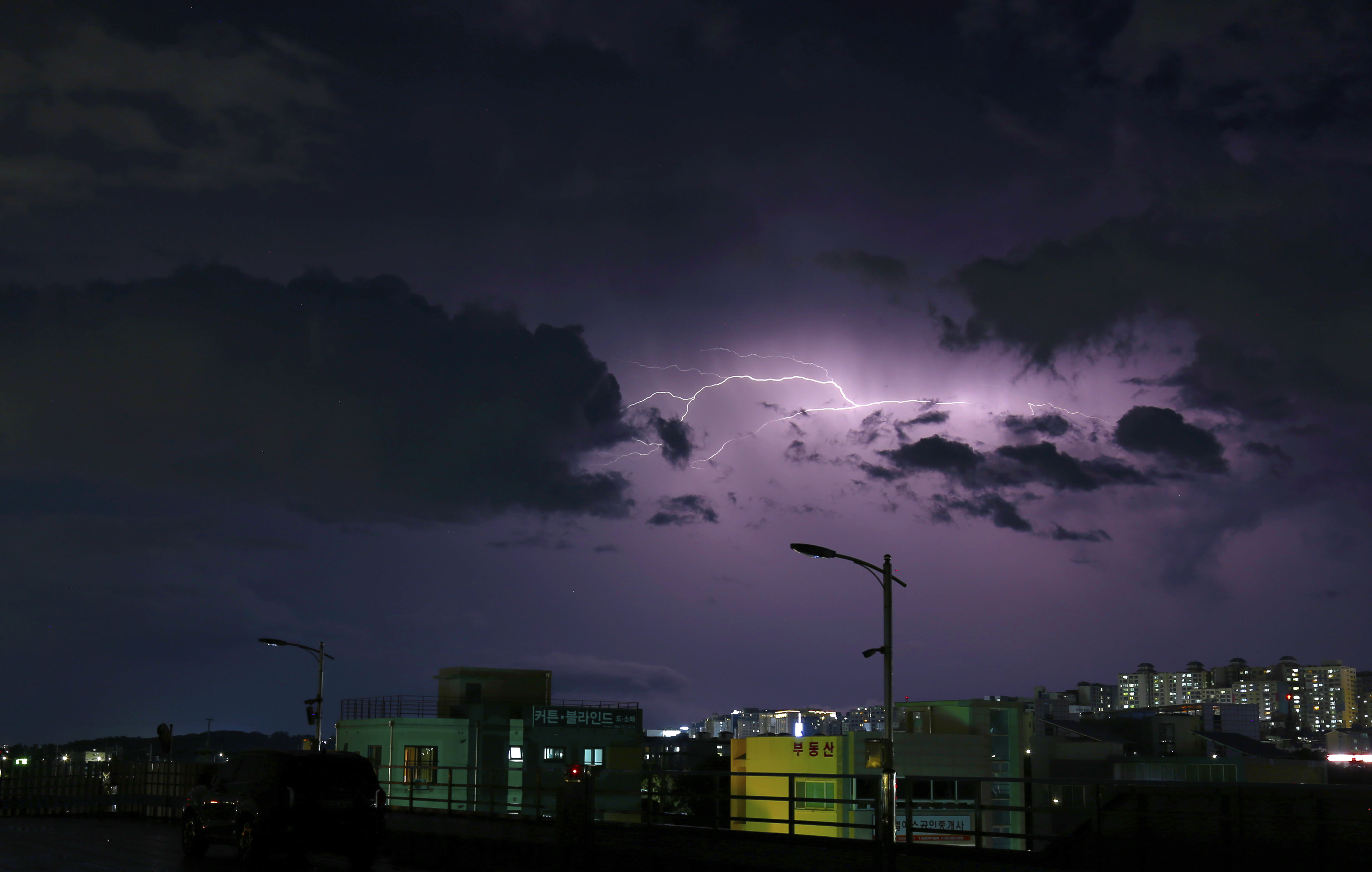번개 사진 촬영에서 가장 중요한 것은 기술보다도 안전입니다. 번개는 언제 어디로 떨어질지 알 수 없기 때문에 개활지 한가운데, 나무 바로 아래, 전봇대 근처 등은 피하셔야 합니다. 금속 삼각대는 번개에 직접 노출될 경우 위험할 수 있으니, 반드시 안전 거리를 확보하세요. 자동차 안에서 삼각대를 세워 창밖으로 촬영하는 것이 가장 안전한 방법 중 하나입니다. 하지만 자동차 안에서 조금이라도 움직이면 미세한 진동이 있기 때문에 주의해야 합니다. 저는 주로 처마가 있는 곳에서 촬영하곤 합니다.